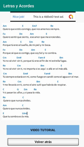 แอปพลิเคชั่นนี้มีเนื้อเพลงฟรีและคอร์ดเพื่อเล่นกีตาร์ พวกเขายังมีวิดีโอกวดวิชากีตาร์ที่จะช่วยให้คุณเรียนรู้การเล่นกีตาร์และมันจะช่วยให้คุณสามารถสัมผัสเพลงของศิลปินที่คุณชื่นชอบ แอปพลิเคชันจะทำการอัปเดตอย่างต่อเนื่องเพื่อให้คุณมีเนื้อเพลงและเพลงมากขึ้นและเพื่อให้คุณมีเพลงที่กำลังฟังอยู่ในวันนี้ ฉันจะใส่เพลงโบราณที่มีชื่อเสียงมากที่ทำเครื่องหมายทศวรรษ แอปพลิเคชันจะมีจดหมายและคอร์ดของศิลปินจากทุกที่ในโลกเพลงทั้งในภาษาสเปนและภาษาอังกฤษ คอร์ดสามารถสัมผัสกับกีตาร์ประเภทใด ๆ , กีตาร์ฟลาเมงโก, อะคูสติก, electroacustic .... ถ้าคุณต้องการเพลงจากศิลปินบางคนหรือมันไปที่แอปพลิเคชันศิลปินคอนกรีตบางคนเท่านั้นที่จะขอจดหมายติดต่อฉันและ ในอีกไม่กี่วันคุณจะมีเพลงที่คุณถามฉัน