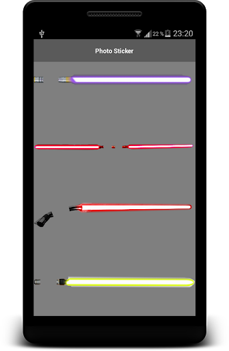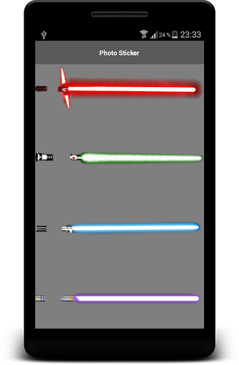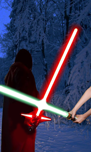 This is Photo Maker for Lightsaber. Take a picture or choose an image from gallery. Add your favourit Light Saber from many different Lightsabers with the plus button and touch and drag it to the position of your hand. Multi-touch to resize and rotate it to the right direction.