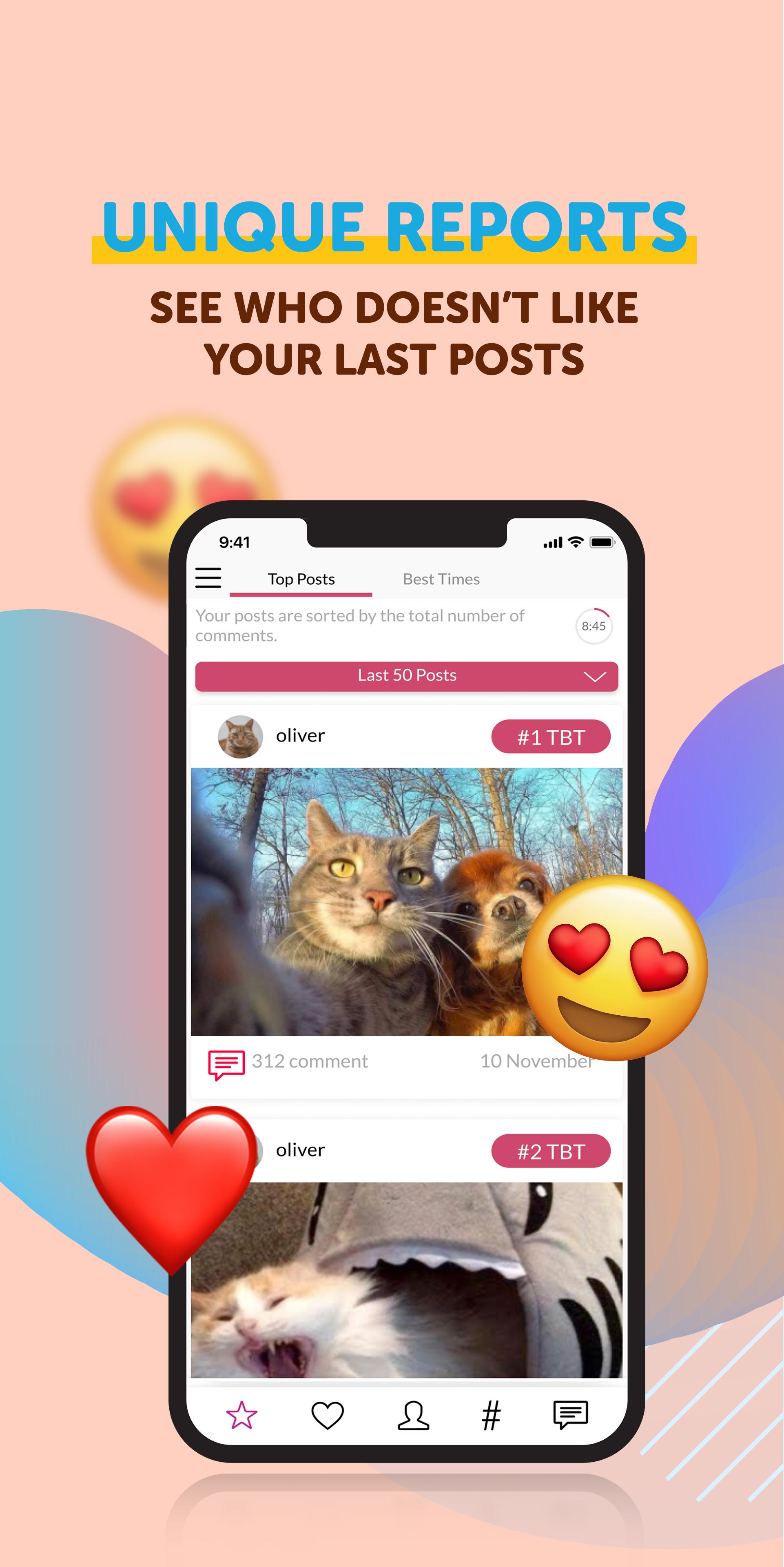 Liker Analyzer lists your top likers and top posts. You will instantly discover which of your friends are your best likers and which of them are the worst. You can check out which posts they liked until now. Also, the app ranks your posts based on the number of likes from the most to least.