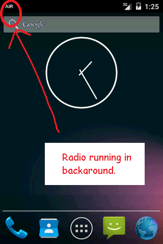 Radio plays in background automatically. If any radio station name is red then its playing. To stop radio, just make sure all station buttons are green.