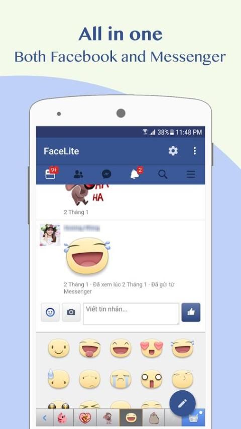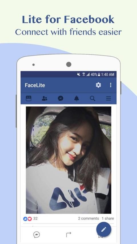 A free and Lite for Facebook - Security Enhanced app, it allows you to chat and connect with your Facebook friends, send emoticon, videos, images, gift, newsfeed, comments, etc... and less permissions.
