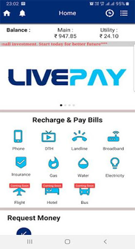Live Pay is the best app for all your mobile prepaid recharge, DTH recharge, postpaid bill payment, electricity bill payment, water bill payments, gas bill payments, money transfer and payments. Pay your insurance premiums, LIC premium payments etc.
