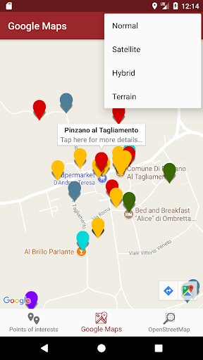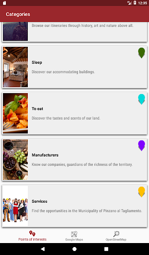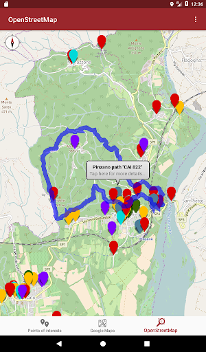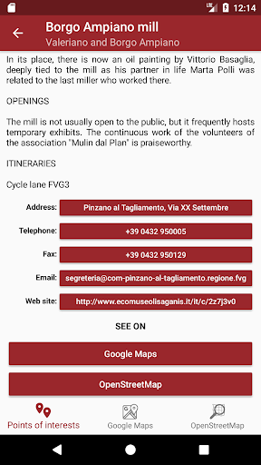 With Google Maps you can start a navigation that will show you how to reach a point of interest you want, with OpenStreetMap you will have more details of the entire territory of Pinzano.