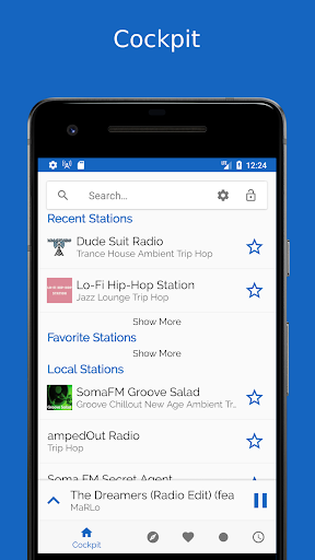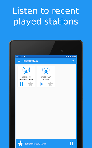 You can pause and resume your current radio stream. If your station sends information about the played songs, all songs listened are also shown and can be easily be bookmarked with one click.