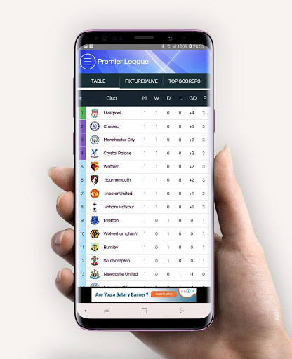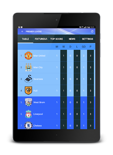 * Premier League table: see all teams' points, matches played, wins, losses, draws and goal differences.
