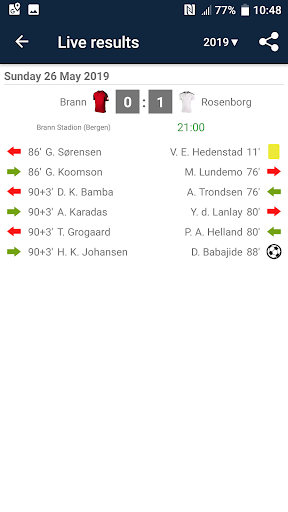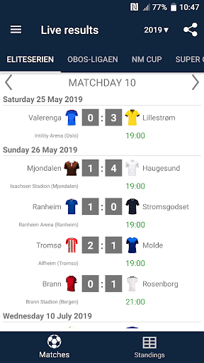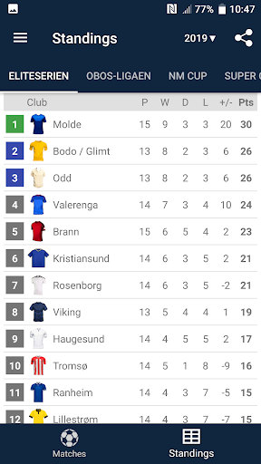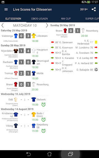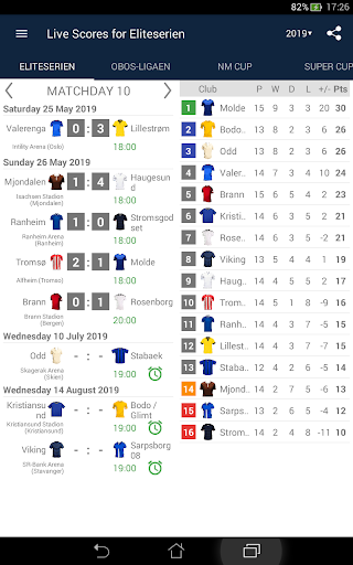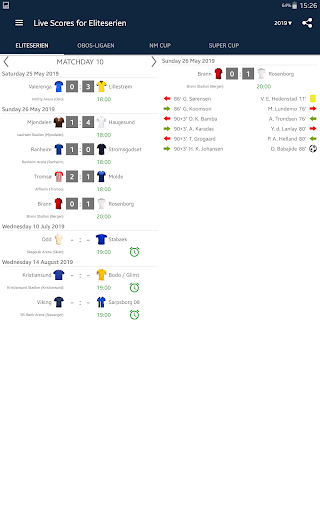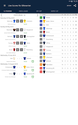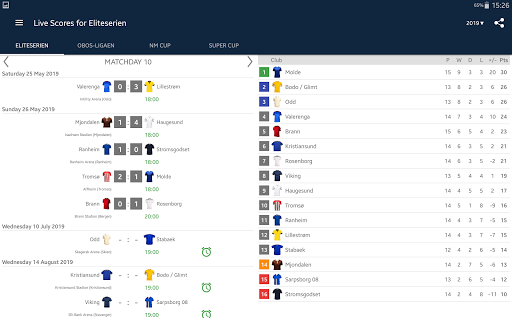 Live Scores for Eliteserien is the app that will allow you to follow the matches of Football Championship in Norway, even you do not have possibility to watch TV or live stream. It includes a schedule of matches, standings and results of Eliteserien, OBOS-ligaen, NM Cup and Super Cup. With the application you will not miss a goal or begin of a match, because it will send you a notifications. You can select favorite matches and receive notifications only for them. In Eliteserien season 2023 play the teams: Rosenborg, Ham-Kam, Sarpsborg 08, Odd, Aalesund, Tromso, Stabaek, Valerenga, Sandefjord, Stromsgodset, Lillestrom, FK Bodø/Glimt, Haugesund, SK Brann, Molde and Viking.