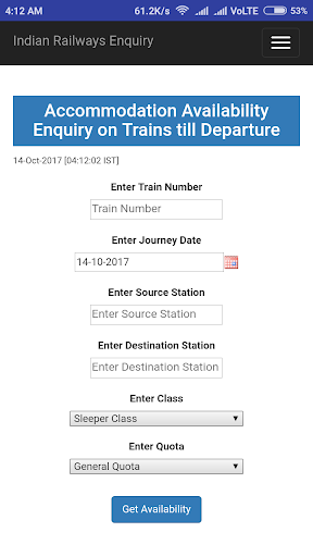 ● Current Booking - Current booking availability in trains from a station within 4 hrs of departure. Shows all classes availability at once.
