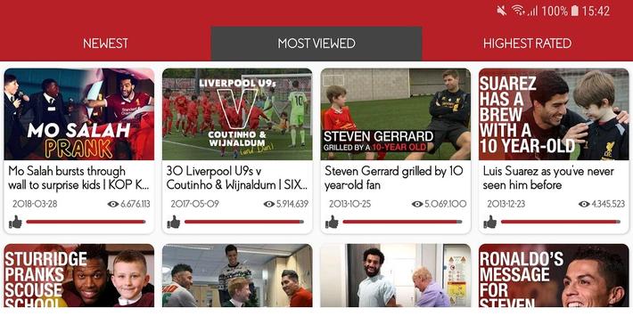 This application helps all fans of Liverpool FC collect top videos and play them in the most simple way, which include: new updated, most viewed and highest rated videos. Besides, the nice interface is provided by this application to allow you play these videos easily, as well as display important information like total view, published time, like rate and so on.