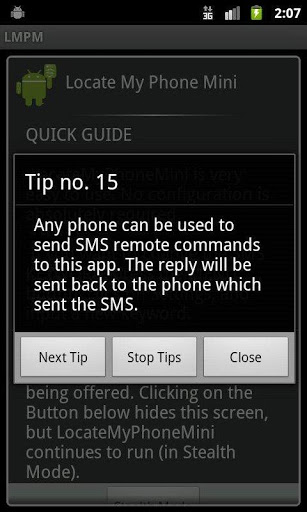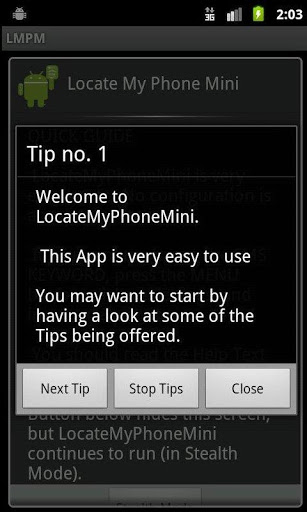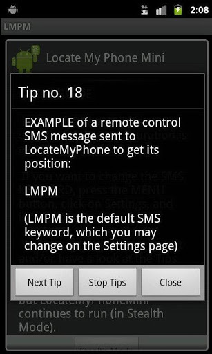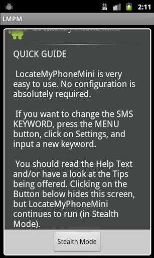 Extremely simple to use. Works everywhere, even without an Internet connection. This App will assist you in locating your device if it has been misplaced, lost or stolen. By sending it an SMS Message, you can remotely make the phone ring and get its position, address if found and battery level. You can also use it to locate a child and for other tracking purposesNOW ALSO WORKS ON TABLETS WITH SIM CARDremote Installation is only possible with Android 2 and 3 and NOT Android 4It is installed with the name LMPM, to make it less obvious what it doesFeatures:NO CONFIGURATION REQUIREDMAKE PHONE RING even if set to silentSEND AN SMS TO IT, TO FIND ITS POSITION, ADDRESS and BATTERY LEVELSEE THE POSITION ON A MAPGET SMS IF SIM CARD IS CHANGEDALL SMSs ARE HIDDEN FROM THE USER OF THE PHONERESTARTS AUTOMATICALLY AT PHONE POWERONMAY EVEN BE DOWNLOADED AFTER YOUR PHONE HAS BEEN LOST STARTS AUTOMATICALLY AFTER DOWNLOAD This MAY make it possible to find your phone if you have already lost it After LocateMyPhoneMini has been started, you can forget all about it. Even if the phone is turned off and on again, it will restart automaticallySend an SMS to it, containing the word LMPM to get its position after a short time.Send an SMS with the words LMPM MaxRingingVolume to enable the ringer in case it was set to silent. Then you can make normal phone calls to it, to hear and locate it.The words LMPM RingAloud makes it ring for three minutesIf you download this App after the phone has been lost, it can find its position PROVIDED that the Localization determined by Wireless Networks has been enabled on your phone You should also have a look at Thief Face Trap Mini, which has ALL of the same features as this app, and which IN ADDITION also cantake secret PICTURES of people who try to use your deviceThis App is primarily meant to be very easy to use, for locating a lost or mislaid phone. If you want a more secure App but one which may be a bit more demanding to use which also enables you to remotely lock the screen and wipe data, and which protects against uninstallation, you should have a look at Locate My Phone LiteAn important difference between LocateMyPhoneMini and similar applications is that this app requires NO REGISTRATION, and there is NO MONTHLY FEEIf you have concerns about installing those apps which require that you hand over full control over your phone to some remote website this may be the app for you. LocateMyPhoneMini does more or less the same as those apps, while you are keeping full control over your own phoneHere is how you can do a remote install:1. Data WiFi or Network must be enabled on the phone, and a Google account logged into the phone. If you previously have downloaded anything from the Market, an account is already registered on the phone2. Find the App on the Market on this page3. You must be logged into Google, at the top right corner of the screen4. Click 39;Install39; next to the app icon5. Select your device and click installThis free Version of LocateMyPhoneMini has most of the functions of the full Version, EXCEPT ListCalls, and that the WIRELESS NETWORK and NOT the GPS is used to obtain the Position of the Phone. You can use it for an unlimited period of time. If you like it, and you would also like to have more accurate GPS Positions, you may want to buy the Full Version; the LocateMyPhoneMiniHiddenThe paid version also has another advanced feature: It will hide its LAUNCH ICON in Stealth Mode. Which makes it hard for a thief or person being tracked to detect its existenceIf you have a problem, please send us an email. Just giving a low rating does not make the app any better