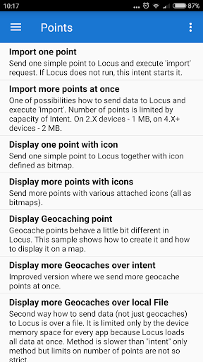 - see how your app can import and display points in Locus, display geocaches, request point IDs etc.