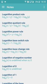 • Notes section with basic logarithm rules