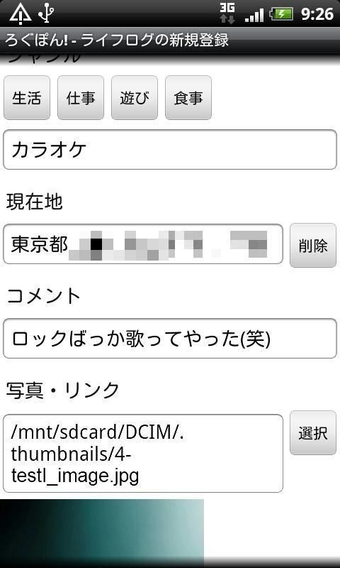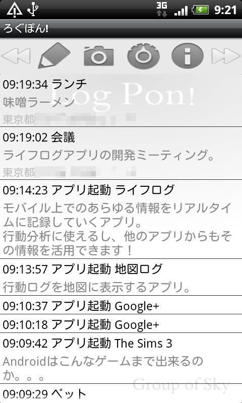 Let's make the life log. This application program is a tool for the user to make the life log easily. ・Good morning. → Getting up log making ・The pet announced a wonderful technique. → The photograph is taken and the log is made. ・Invitation call of play. → Let's take notes to the log generated automatically. ・Action record making to "Good evening" during a day. The above-mentioned reason exists, and my record can be made and be edited easily, and in detail. - The main function ・Life log function for creation matched to your behavior. ・The photograph can be taken, and it append it to the life log. ・The memo can be given to the life log that the LIFELOG application program generates automatically. ・As for the life log that LIFELOG generates, a selection setting that is 40 kinds or more more detailed can be done. ・Location information giving for GPS and the circumference function. - Additional schedule function ・External export function of life log - Test Tarminal HT-03A / HTC Desire HD - Version explanation 00.05.00: Release first time 00.06.00: add Location Info - Key word LifeLog, Logger, and logger and image, Location ,GPS , network , Address