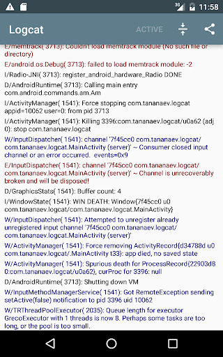 Read Android logs without root access. The app uses remote debugging to connect to phone local ADB daemon. Configuring remote debugging on a phone can be challenging and requires some technical expertise. It has to be done once and after each device reboot.