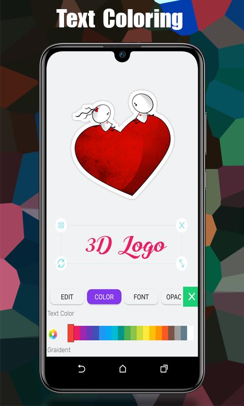 Logo Maker/3D Logo Maker also provides professional photo editing and text editing tools like: Flip, Rotate, 3D Rotate, Resize, Curve, Font , Color,Shadow,Gradient,Texture,3D Tools, Hue and lots more that you'll need to create beautiful original logos.