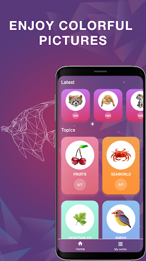 Drag a piece of low poly art to the right place according to the shape and the number, continue filling in the playground area with puzzles, finish your masterpiece and reveal a wonderful art.