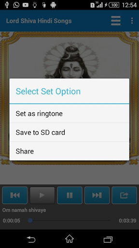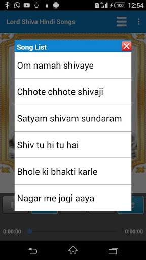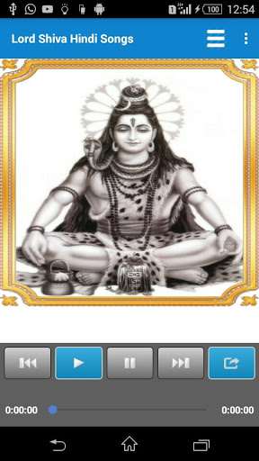 Lord Shiva devotional hindi songs with play, pause, next, previous, select song features.