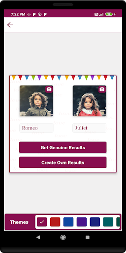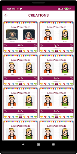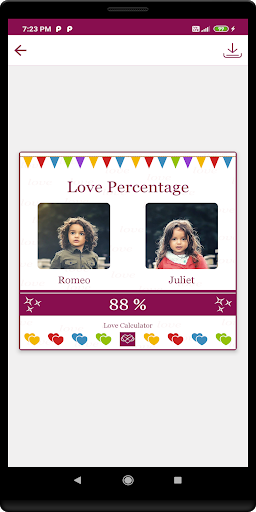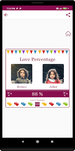 Love Calculator a numerical magic. Where we can your and your partner images and you can calculate your love percentage with your partner. You can save and share the results with your partners and it's not a random generation result and we applied some calculations.Here the best advantage in this app is if you unsatisfied with genuine results then you select whatever result you want.
