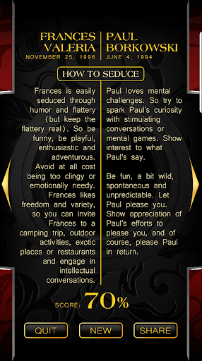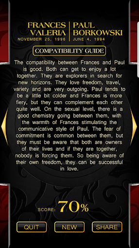 This handy app calculates your love compatibility with another person quite accurately using astrology and pythagorean numerology. These calculations therefore are based on actual science and not random numbers.