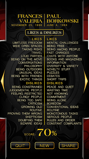This app also let you share your compatibility score with other people via: email, SMS, Facebook, Twitte, WhatsApp and others.