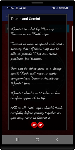 To use this app, simply enter your star sign and then another. Touch the match button to find out whether a romantic/loving relationship is possible or whether you should run a mile!