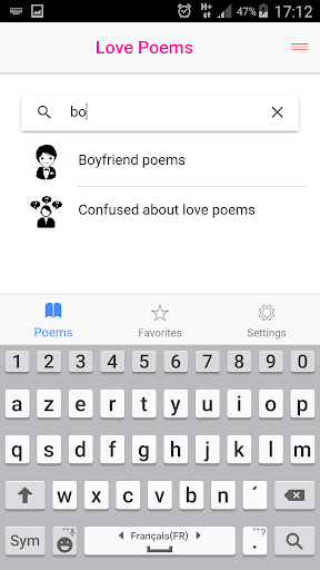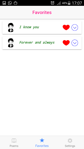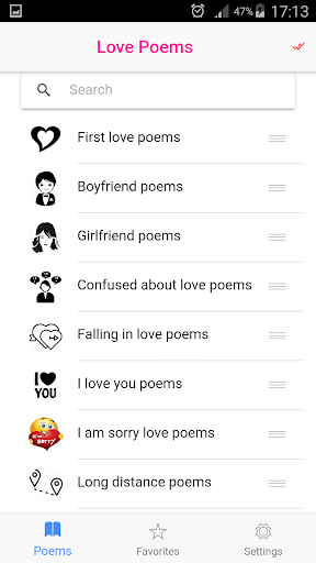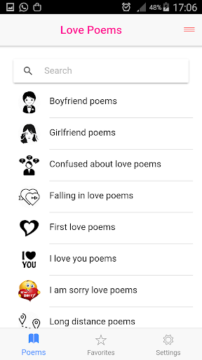 Whatsapp, Email or any other social application. You can also choose your favorite poems or find a list of categories with a search bar