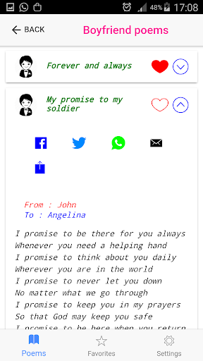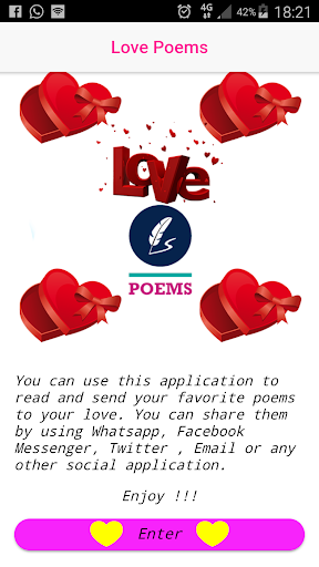 You can use this application to read sweet and love poems and share your favorite love poems with your love using Facebook, Twitter,