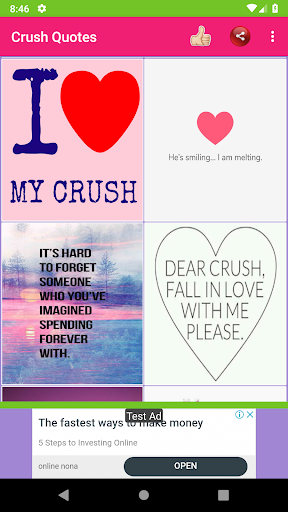 Express your love feelings with cute crush quotes for him or her using this free software app. This quote app store several great quotes about crush and love which describe your love feelings to dear ones. Discover more photos for crush images and deliver them to your sweetheart. Wish and share your daily crush quotes to your sweetheart across social platforms such as whatsapp, fb, share chat, etc,.. with single tab. No need to use the internet to access the quotes. Internet is required only when sharing the images for quotes.