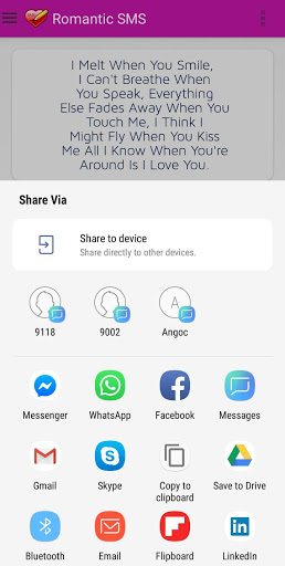 - Unlimited sharing of your favorite custom messages to contacts via SMS, various sharing or messaging application.