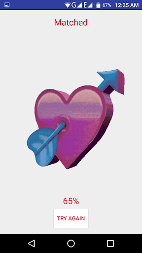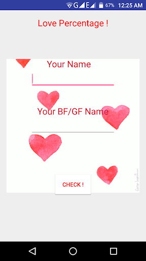 In This application you have to put your name and your Girlfriend or boyfriend name . Than calculate the percentage how much you guys matched. good Luck have Fun with this app!!!