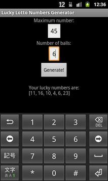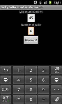 This is an easy to use Android application which generates lucky numbers for you. All you need is inputting the maximum number (default = 45) and the number of ball (default = 6). Then click on the button 'Generate'. Good luck!