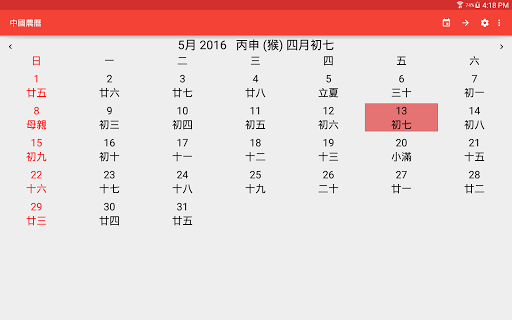 Chinese lunar calendar with no ads. Features: * supports both Traditional Chinese and Simplified Chinese * designed to support both phone and tablet interface * Multiwindow feature
