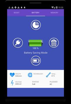 The next tab of the RAM Clear App is called "Battery" where you can find the necessary information about your battery including the current battery charge (in percentages), lifecycle, status (charging or not at the moment), battery type and even a temperature of the main processor.