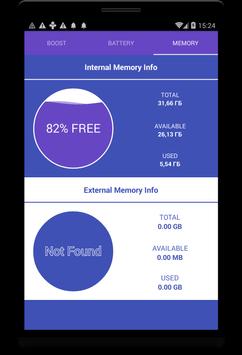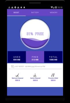 At the main screen of application which called "Boost", you'll see the percentage of free RAM space which can be used for various options and below placed some marks about used, free and total RAM space. The next information which can be obtained by the user is the data about memory cleanup, cache cleaned and killed processes. Also, you can click the big button at the center of the screen to clean your RAM.