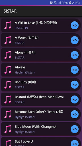 In this application you can find great number of SISTAR lyrics. This application does not contain audio or video. It only contains the lyrics, the title and the name of the artist.