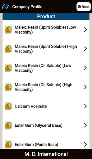 M. D. International is having factory at Palghar (Maharashtra) and engaged in production of wide range of Synthetic Resins such as Ester Gum (Glycerol Base), Ester Gum (Pentaerythritol Base), Maleic Resin (Spirit Soluble), Maleic Resin (Oil Soluble) and Calcium Rosinate, used for industrial paints, protective coatings, printing inks and adhesives and rubber. Besides resins of standard specification, M D International also offers tailor-made resins as per requirements of the clients. The plant is equipped with state of the art with modern technology with the production capacity of 800 M.T. P.A. in house laboratory is set up for the R and D department. They are having the team of professionals which is taking care of quality and services to their clients. Their aim is to provide the best of service to their clients at a very competitive rate with the best delivery schedule to build a long term relationship.
