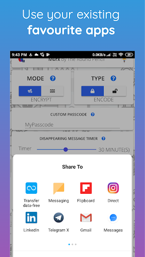 Encrypted Messages, Files & Images from M0rx can be sent/shared through any and all of your favorite apps like WhatsApp, Facebook Messenger, Snapchat, Telegram, SMS, Hike, WeChat, Viber, Skype etc.