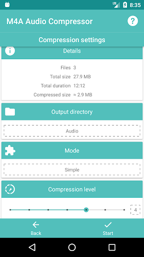 M4A Audio Compressor will allow you to compress your favorite audio and music files. Freeing space on your device. Or to make it easier to send by mail and social networks.