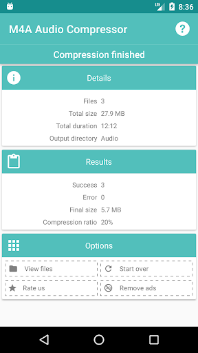 Nice app. I've been able to compress 113mb audio to 28mb. An excellent app. Thanks to the developer!