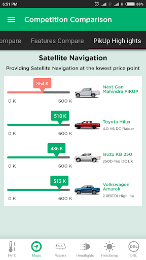 The app also provides a quick comparision of the competiton models in your market & how it is placed wrt pricing & features. You can download the advertisements & some video content for the pikup from this app.