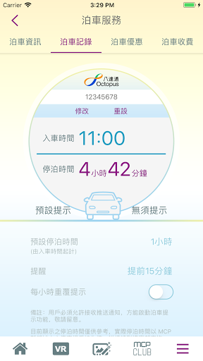- Parking Record and Parking Alarm: Input your Octopus card number to check parking record and set parking alarm.