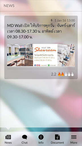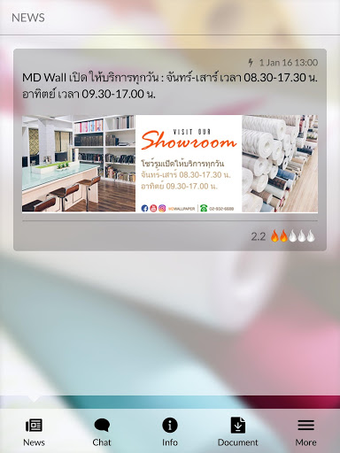 MD Wallpaper Mobile Application ช่วยอำนวยความสะดวกให้ลูกค้าสามารถเลือกชมลายวอลเปเปอร์ต่างๆของเรากว่า 8000 รายการผ่านทางระบบ e-catalog ลูกค้าสามารถดูรูปภาพห้องตัวอย่างและข้อมูลของสินค้า, สอบถามข้อมูลการบริการใน Chat Room, และรับข่าวสารกิจกรรมโปรโมชั่นพิเศษต่างๆ ให้บริการสำหรับลูกค้าทั่วไปและตัวแทนจำหน่าย
