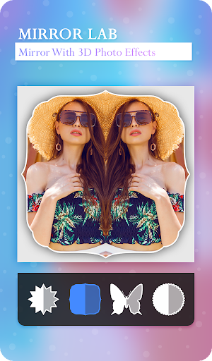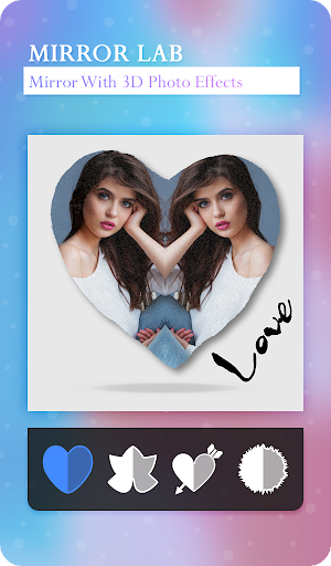 25 different reflection effects of mirror and 20 different 3D mirror shapes to create mirror photo with using shapes. 3D mirror contains shapes live love, heart, square, rounded, bubble, books & many more concepts. Easily create any types of mirror photo frame by just two easy steps. Drag and drop to change photo position and one tap to change reflection effects. Create double faces effects and looks like twin photo.