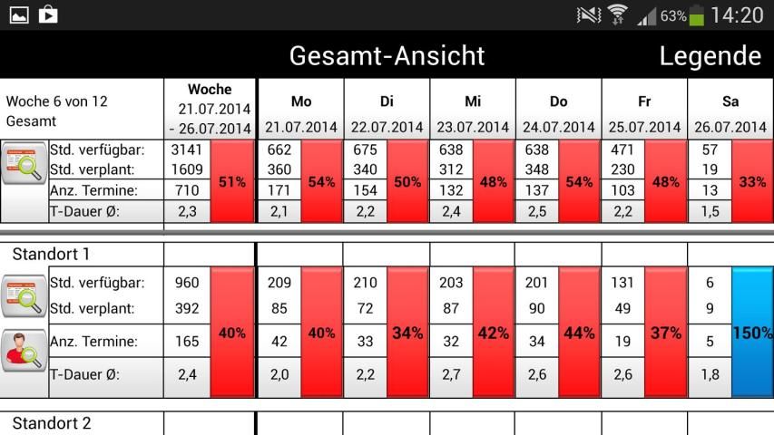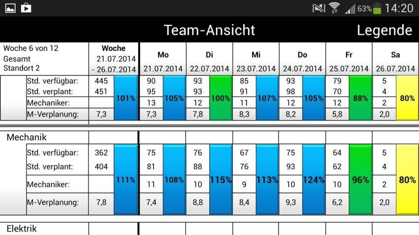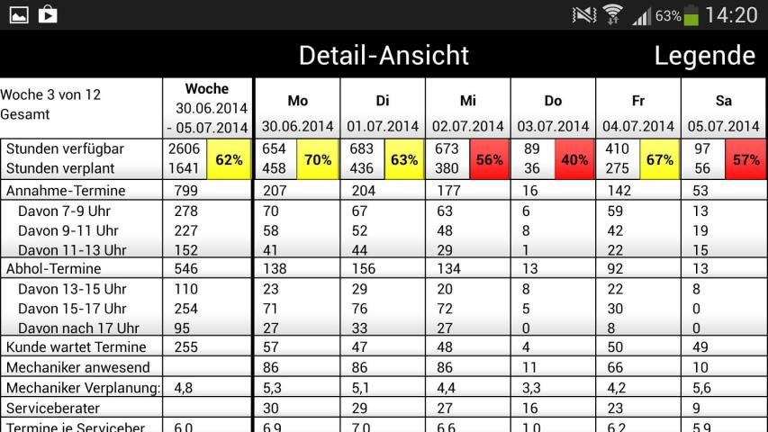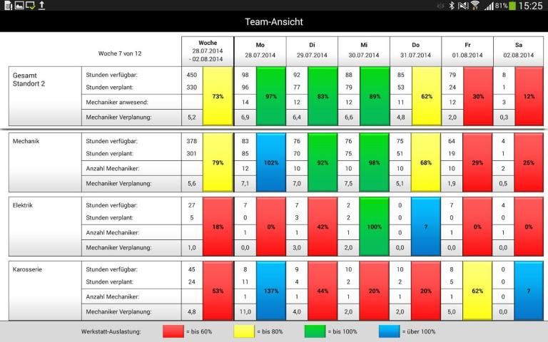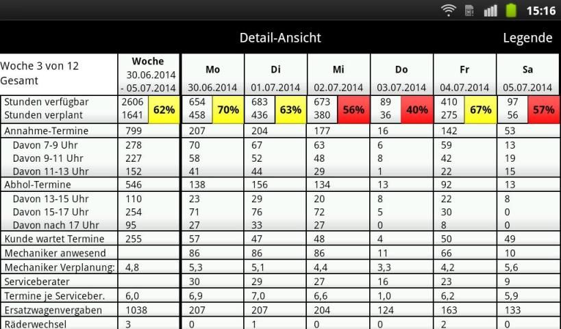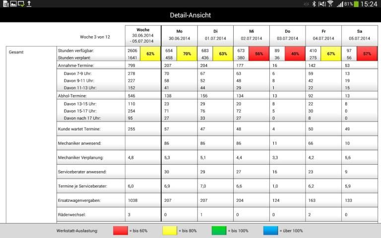 Available and verplante capacity, average occupancy per mechanic, service advisor, number dates, number Radwechseltermine, "customer is waiting," etc. The system also shows capacity data and Verplanungen individual working groups in the locations to.