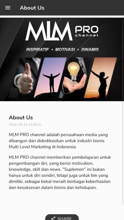 MLM PRO channel adalah media pembelajaran untuk pengembangan diri, yang berisi motivation, knowledge, skill dan news. "Suplemen" ini bukan hanya untuk diri sendiri, tetapi juga untuk tim yang dimilikinya, sebagai bekal meraih berbagai keberhasilan dalam bisnis dan hidupnya.