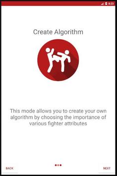 In the second mode, you can build your own algorithm by choosing the importance of certain fighter attributes such as height, reach and wrestling. Then, using the algorithm you just built, you will receive a prediction about the outcome of a fight between two fighters of your choosing.