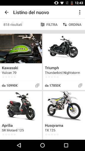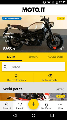 On Moto.it's App, which is reserved to private users, you can find thousands of ads of used and new motorcycles, used and new scooters, vintage motorcycles, accessories and spare parts, which are freely accessible thanks to a user friendly interface that allows you to surf through the different brands and models.