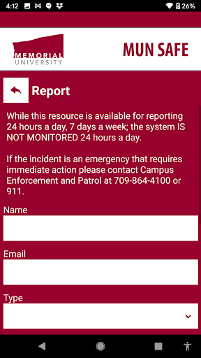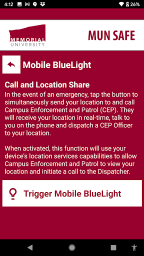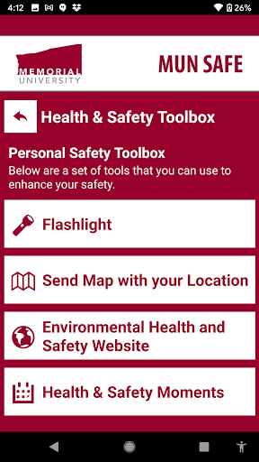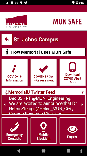 MUN SAFE is the official safety app of Memorial University of Newfoundland. It is the only app that integrates with MUN's safety and security systems. Memorial University of Newfoundland has worked to develop a unique app that provides students, faculty and staff with added safety on campus. The app will send you important safety alerts and provide instant access to campus safety resources.