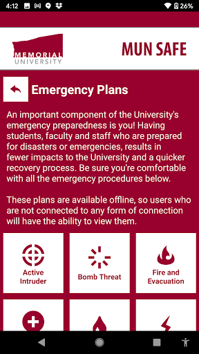 - Emergency Plans: Campus emergency documentation that can prepare you for disasters or emergencies. This can be accessed even when users aren’t connected to Wi-Fi or cellular data.