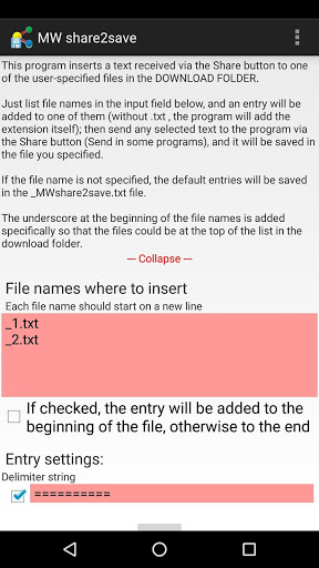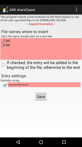 MW share 2 save is a small program that saves a received text in a file (to the Download folder of your device) via the Share button.