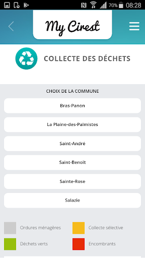 - Calendrier de collecte des déchets, organisé par catégories (Ordures ménagères, Collectes sélective, Déchets verts, Encombrants), le tout piloté par une recherche rapide par commune et par rue.